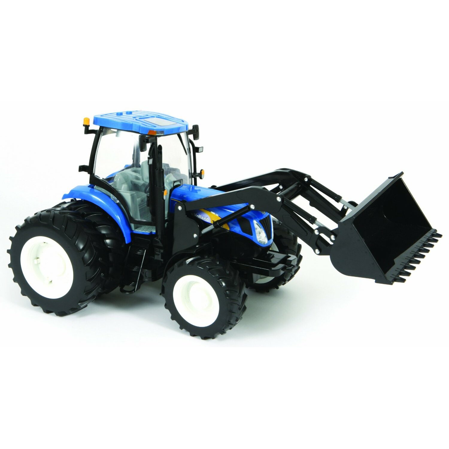 All Big Farm toys are finished in high quality durable plastic and come complete with a range of exciting features for realistic and fun farm play! Big Farm models are more than tough enough to take on any outward bound activity inside or outside the home if your child can go there, Big Farm can too! The New Holland T7050 Tractor with Dual Wheels and Loader features working cab lights, realistic engine and reversing sounds and has active steering which can be accessed either through the open rear cab window or by detaching the cab. It has a detachable set of rear dual wheels and a fully functional front loader that raises and lowers, has a pivoting bucket and can be detached. The bonnet can be opened, there is a height adjustable rear hitch and the tractor is complete with realistic tyres. The tractor is compatible with implements from the Britains Big Farm range and other 1:16 scale plastic farm play toys. The New Holland T7050 Tractor with Dual Wheels and Loader will help youngsters recreate hours of exciting developmental role play!
