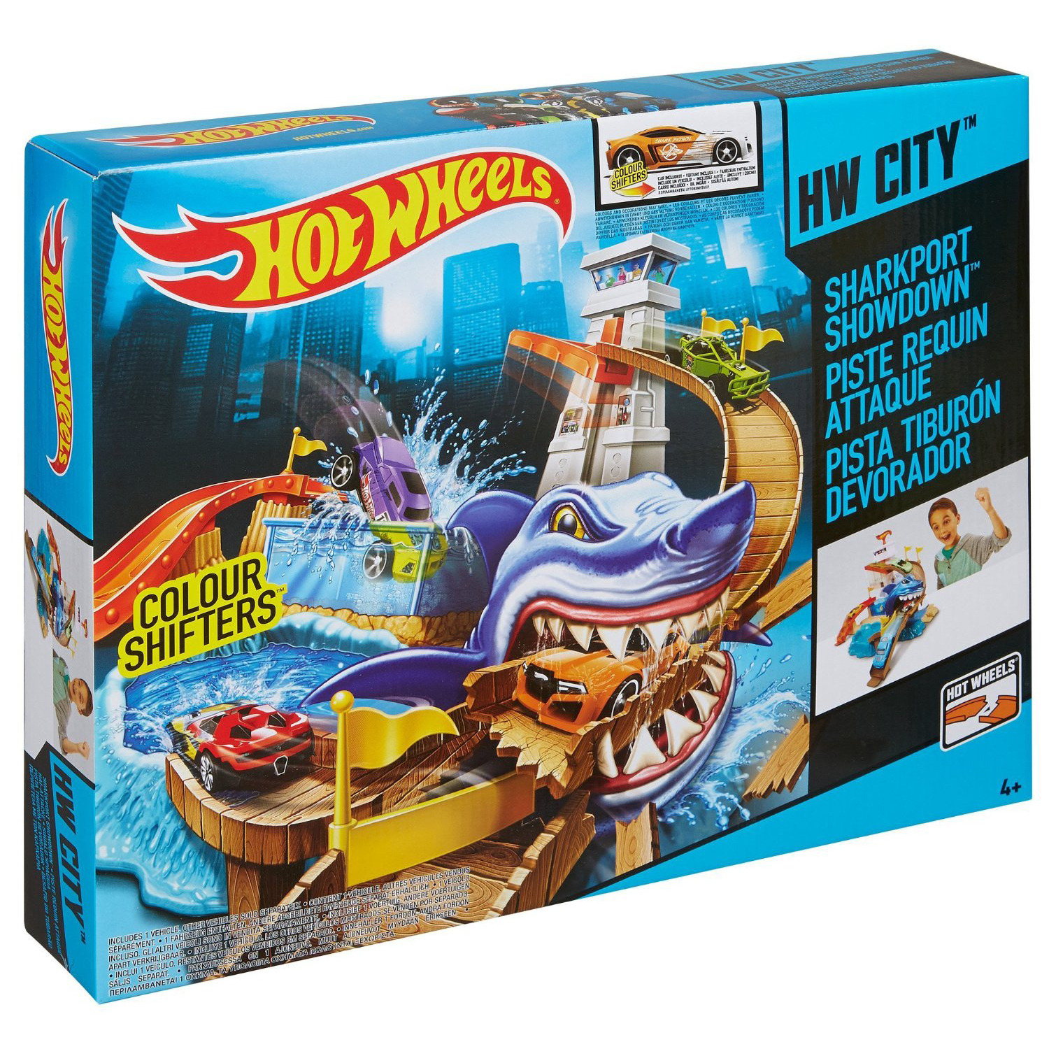 Escape the giant car-chomping shark in this exciting, action-packed, Colour-changing thrill ride. Speed down from the top of the tower ramp, but watch out – the shark is hungry for some metal munchies and ready to trap your vehicle in his chomping jaws! If you get caught, send another vehicle down the ramp and aim for the release lever. Hit it just right and youll launch your trapped car to safety. Miss and you could fly off the trackthen both of your cars are shark food! Sharkport Showdown comes with a Colour Shifters car and two Colour-change zones: a dunk tank and splash pool.