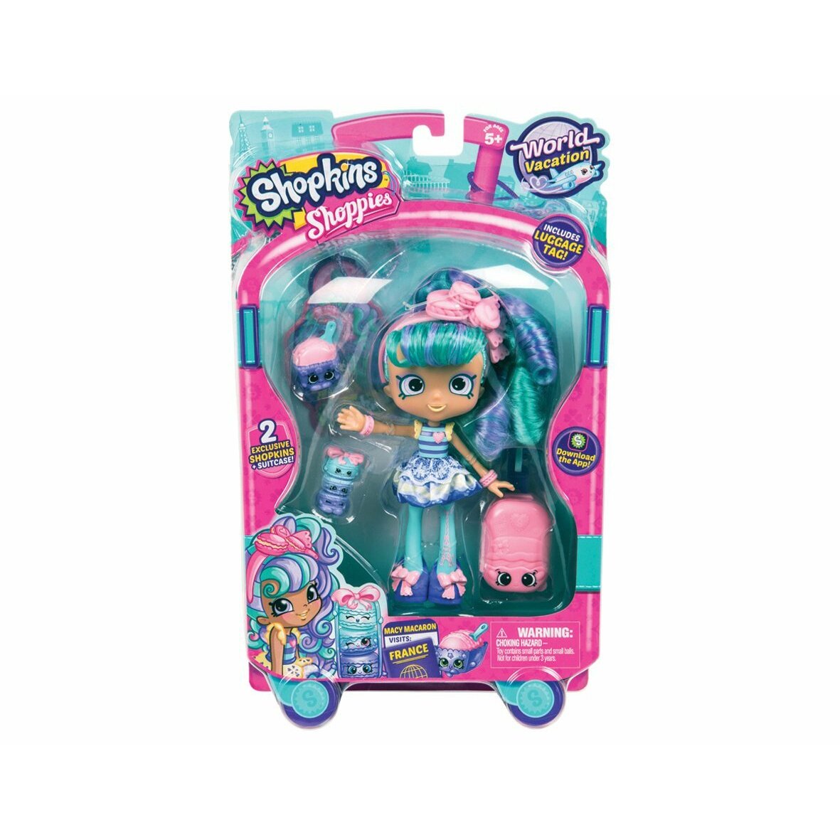 Shopkins Shoppies are a range of fabulously fashionable dolls and playsets! each doll has a fun theme which is reflected in their outfits, hairstyles and personality! each travel themed Shoppies doll comes with 2 exclusive Shopkins, a luggage bag, a new stand and a luggage tag VIP card to use with the free app. Join the Shoppies world vacation! pack your bags and make your way to the departure lounge, the Shoppies world vacation is now boarding! visit fabulous cities and share some high flying fun with these world class Shoppies and their Shopkins friends! Collect all 3 of the European travel themed dolls: spaghetti Sue who is Italian themed, Macy Macaron who has a French theme and Jessicake who has a UK theme. For ages 5 and over. Contents: Shoppies doll, 2 exclusive Shopkins, 1 suitcase, 1 passport, 1 stand, 1 VIP card. ONE SUPPLIED.